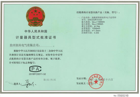 熱烈祝賀徐州依科電氣有限公司專(zhuān)利技術(shù)高精度智控矩陣電子皮帶秤EACCOR-B159獲得0國(guó)家0.2級(jí)計(jì)量證書(shū)CPA2018FC0011-32批準(zhǔn)證書(shū),配套高精度矩陣傳感器及矩陣智能稱(chēng)重控制器(采用SEQ-AI智能算法,矩陣控制跟蹤復(fù)核技術(shù),...